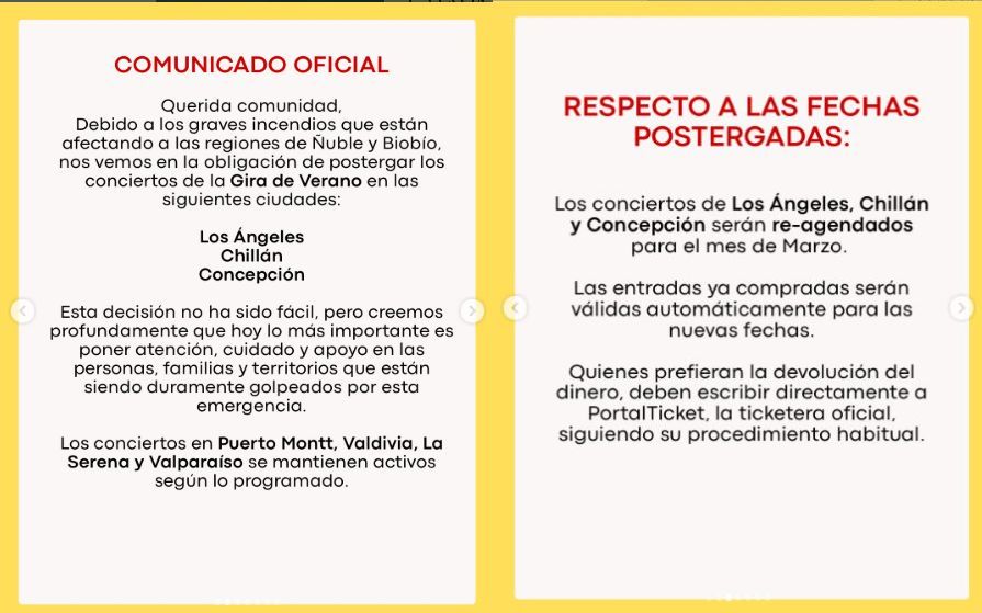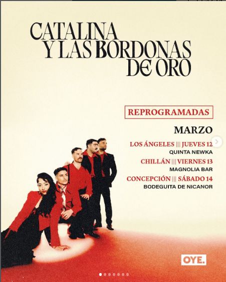 A través de una publicación en su cuenta de Instagram, «Catalina y la Bordonas de Oro» – banda chilena de bolero, canción melódica y folclor latinoamericano – anunció la reprogramación de los conciertos que estaban agendados en Concepción, Los Ángeles y Chillán, a raíz de los graves incendios que afectan a las regiones de Biobío y Ñuble: